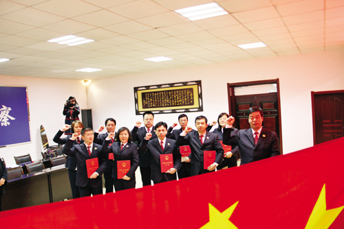 2 月25 日,岢嵐縣檢察院舉辦首批入額檢察官宣誓儀式。該院是忻州市檢察系統(tǒng)2015 年司法體制改革首批試點(diǎn)單位。一年以來(lái),經(jīng)過(guò)層層選拔,首批10 名檢察官脫穎而出,市檢察院和岢嵐縣人大、政協(xié)領(lǐng)導(dǎo)到場(chǎng)祝賀,希望入額檢察官擔(dān)當(dāng)重任,充分發(fā)揮職能作用,維護(hù)好社會(huì)公平正義。(程玉光 攝)