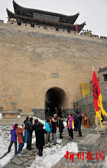 “兩節(jié)”過后的雁門關(guān)景區(qū),一片銀裝素裹讓南來北往的游客沉醉在山舞銀蛇、關(guān)樓雄壯、長(zhǎng)城如蟒的北國(guó)風(fēng)光之中,體驗(yàn)邊塞生活,抒發(fā)懷古幽情。圖為游客在雁樓前停留。(石俊文 攝)