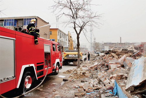 3月3日,忻府區(qū)城南片區(qū)拆遷工作全面展開,為避免城建拆除工作給周邊居民帶來的污染,忻府區(qū)領(lǐng)導(dǎo)迅速行動,安排部署區(qū)公安消防大隊消防車在拆遷現(xiàn)場及時進(jìn)行降塵灑水作業(yè)。圖為降塵灑水現(xiàn)場。(侯睿 攝)