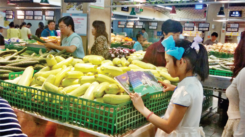 5 月22 日下午5 點多,記者在城區(qū)家家利超市看到一個小姑娘在菜攤前認真看書,等著旁邊的媽媽挑選蔬菜。當(dāng)時超市購物的市民很多,可周圍嘈雜的環(huán)境絲毫沒有影響小姑娘看書的興致。(許凈 攝)