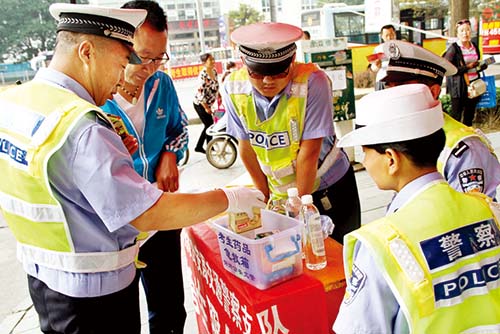 考試期間,市公安局交警支隊在各考點設(shè)置了便民服務(wù)點,備好遮陽傘、雨傘、保溫水桶、礦泉水和考試專用的鋼筆、橡皮。便民服務(wù)臺還放置一個小藥箱,里面?zhèn)溆星鍥鲇汀⒎朗钏?、藿香正氣水、感冒藥、腹瀉藥、速效救心丸、降壓藥等應(yīng)急藥品,以防考生及家長急用。