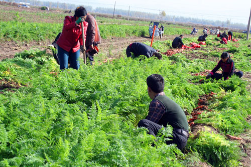 10月29日原平市小河村農(nóng)民正在收獲豐收的回茬胡蘿卜。他們根據(jù)市場(chǎng)需求,實(shí)施訂單和零售交叉種植,滿足不同客戶的需求,使冬儲(chǔ)菜成為土地增效農(nóng)民增收的品牌產(chǎn)品。(趙春曉 攝)