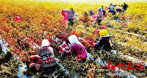 11月18日,定襄縣神山鄉(xiāng)衛(wèi)村農(nóng)民種植合作社正組織勞力采摘辣椒。今年辣椒行情看漲,該合作社種植的辣椒喜獲豐收,又會(huì)有一個(gè)好收入。(張晉蘭 攝)