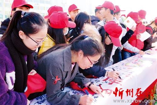 12月1日,在第29個“世界艾滋病日”到來之際,我市在忻州體育廣場啟動了主題為“攜手抗艾,重在預(yù)防”的艾滋病防治宣傳活動?;顒蝇F(xiàn)場,來自市疾控中心、健康教育所等單位的工作人員以及忻州師院的志愿者們通過展板、宣傳欄、發(fā)放資料的形式向市民講解了艾滋病傳播途徑、艾滋病流行現(xiàn)狀與危害、如何預(yù)防艾滋病等方面的知識。工作人員現(xiàn)場為市民答疑解惑,呼吁廣大市民用科學(xué)、理性的態(tài)度正確認(rèn)識艾滋病,不歧視艾滋病病毒感染者。圖為志愿者在條幅上簽名(實(shí)習(xí)記者 王菲 王君 攝影報(bào)道)