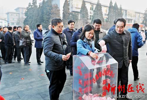 本報訊(記者 任逢春)1月3日上午,我市舉行2016 年度“送溫暖、獻愛心”社會捐助活動啟動儀式,動員社會各界積極參與捐助,為弱勢群體獻上一份愛心。李俊明、賈雪峰、劉鋼柱、王珍、陳義青、王建廷、趙志堅、范波濤、崔建新、王志東等在忻的市四大班子領導和市委、市人大、市政府、市政協(xié)辦公廳干部職工在現(xiàn)場帶頭捐款,鄭連生、阮全進等因公外出的市領導委托工作人員代為捐款。據(jù)悉,當日的捐助活動共收到捐款23550 元。