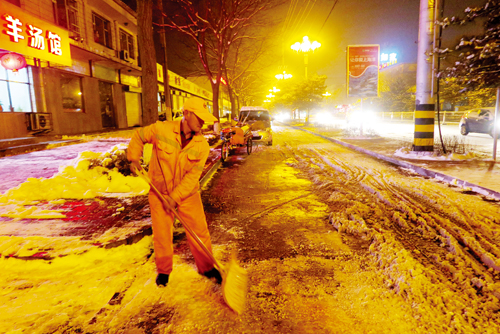 圖為梁順民伴著路燈在長征西街清理積雪 實習(xí)記者 王菲 攝影報道 2月21日1時到18時,我市普降大雪,給市民出行帶來了諸多不便。一大早,在城區(qū)的大街小巷,冰天雪地里身穿橙色制服的環(huán)衛(wèi)工人們手拿笤帚、鏟子戰(zhàn)斗在掃雪一線,為廣大市民出行創(chuàng)造“綠色通道”。夜幕降臨,氣溫越來越低,仍然有環(huán)衛(wèi)工人堅守崗位清理道路積雪。 “今天從凌晨三點,所有環(huán)衛(wèi)工全部出動上路掃雪,一般我們是上、下午輪班,但今天大家都是干了一整天,中午吃飯也是輪著去吃的?!杯h(huán)衛(wèi)工梁順民告訴記者,當(dāng)天正好是他上夜班,要干到晚上十點半。“路面上的積雪要加緊清理,不然結(jié)冰了,第二天一早市民上班出行就更不好走了,也不安全?!?/p> (責(zé)任編輯:籍俊霞) |