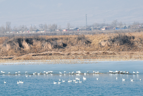 3月3日上午,代縣西茂河水庫(kù)有近百只白天鵝在水面上嬉戲。據(jù)村民說(shuō),西茂河水庫(kù)還是頭一次有白天鵝棲息,說(shuō)明代縣生態(tài)好了。(石俊文 劉睿 攝)