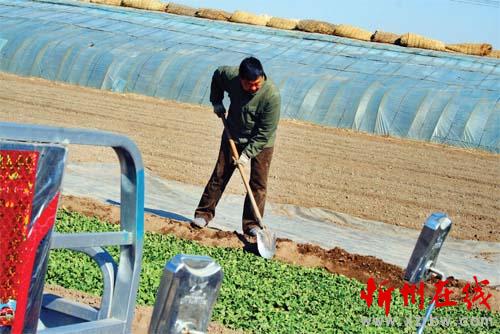 3月9日,原平市解放街村菜農(nóng)馬愣正在為菜地里的菠菜松土