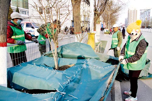3月26日,原平市園林工人正在拆除綠化帶防寒“冬衣”,并為春季綠化帶苗木澆水、補(bǔ)栽做好準(zhǔn)備。隨著氣溫回升,街頭的植物也冒出了綠芽,原平城區(qū)充滿生機(jī)。褚震 攝