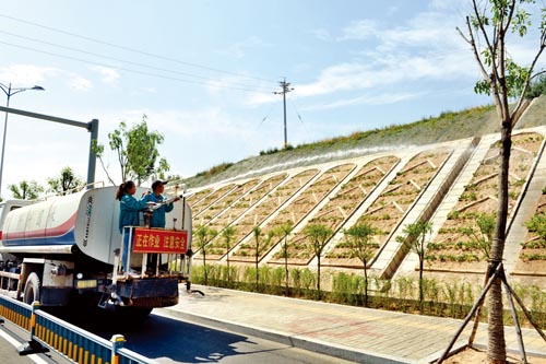 健康街西延道路西側(cè)有段15米高、近1公里長的護(hù)坡,護(hù)坡傾角60度以上,新栽了爬山虎。為了確保新栽植物成活,園林管理局先是要求隔天澆一次、一天澆一次,最近又要求一天澆兩次。護(hù)坡高且陡,日常的人工作業(yè)根本無法進(jìn)行,只能用類似消防車上的噴槍噴水。兩名工人在車尾操作,噴出的水浸濕護(hù)坡后迅速流下匯聚到排水渠。烈日當(dāng)頭,噴水車巡澆一次,往往是澆到最南面,開始澆的最北面護(hù)坡土地表面已見不到什么水分。在一片近似立面的土地上澆水,水分不易保存且土壤容易板結(jié)。松土的時(shí)候,園林工人只能腰系繩索垂吊而下——他們的辛苦沒有白費(fèi),爬山虎全部成活,此地段不久將成為一道壯觀的“綠坡”。