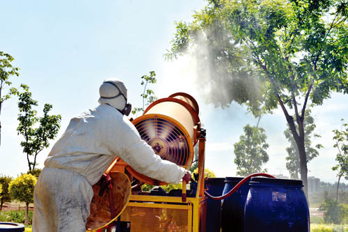 蟲情高發(fā)期單靠人工噴藥已不能遏制害蟲的蔓延,這時(shí)候只能動(dòng)用機(jī)械。盡管噴施的是低毒、低殘留的藥劑,但白天大規(guī)模的機(jī)械噴灑難免對行人、車輛造成不便。豐澤公司晚12點(diǎn)至次日凌晨4點(diǎn)出動(dòng)車載噴霧除塵炮,再熱的天操作工人也得穿上只露出眼睛的防護(hù)服。