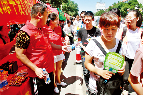 一年一度的中考于6月20日至22日舉行,和高考一樣,中考同樣也牽動著大家的心。原平市志愿者以實際行動為中考學子順利考試保駕護航。圖為愛心人士正在為考生遞水。褚震 攝