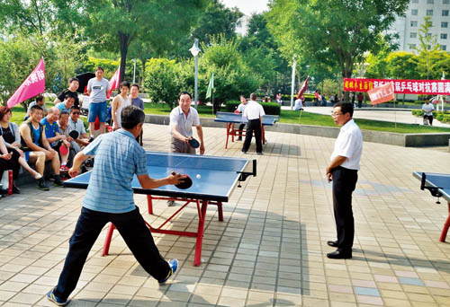 近日,忻州首屆室外乒乓球?qū)官愒诔菂^(qū)和平廣場舉行。本次對抗賽是在忻州和平廣場隊和忻州陽光隊之間進行,經(jīng)過三個多小時的角逐,陽光隊2比1戰(zhàn)勝和平廣場隊,奪得了團體冠軍。個人賽“頭羊”由和平廣場隊隊員奪得,“二羊”由陽光隊隊員獲取。(宮清華 攝)