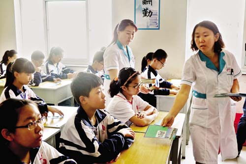 圖為眼科醫(yī)生正在向?qū)W生發(fā)放愛眼知識(shí)宣傳資料 張志遠(yuǎn) 攝