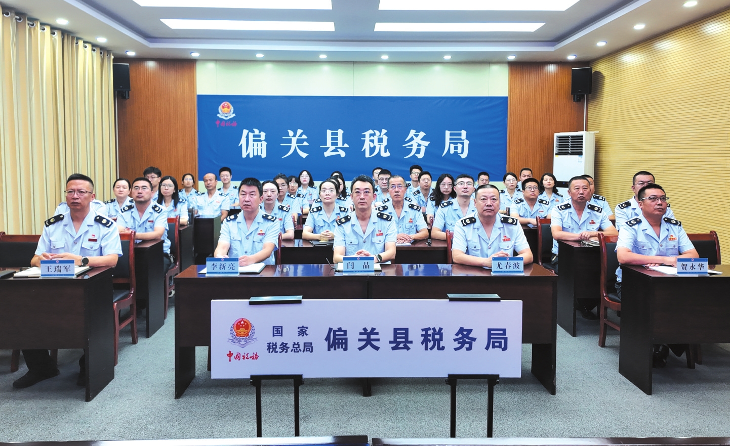 偏關縣稅務局黨員干部觀看紀念大會。賀琦攝