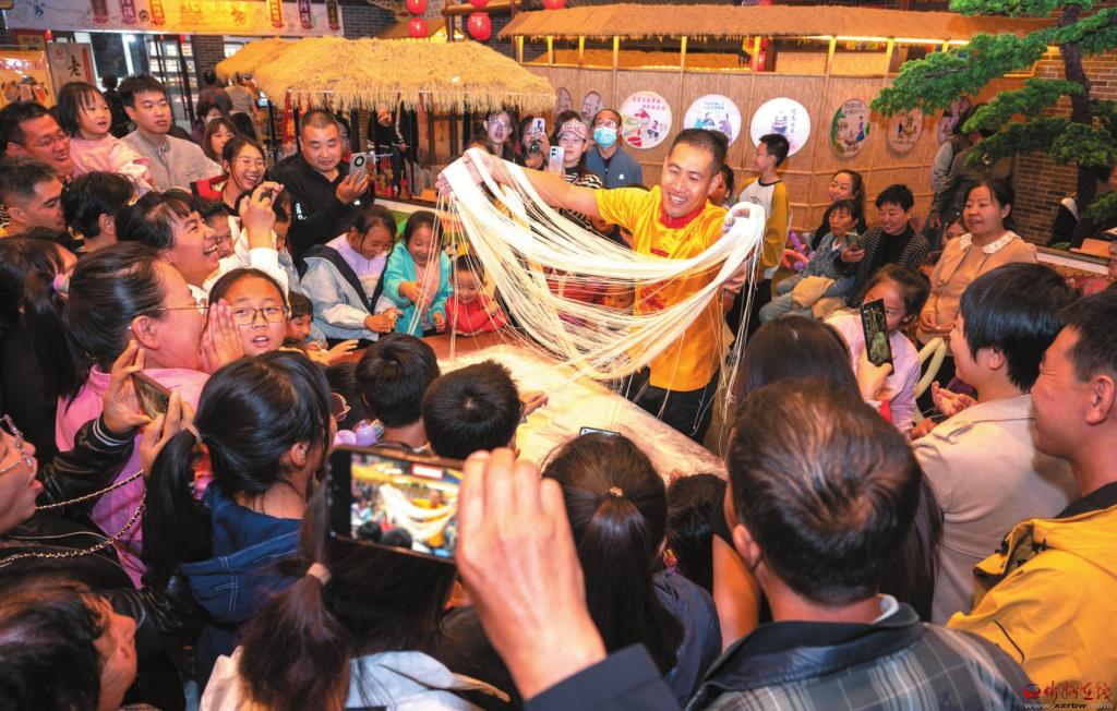 國(guó)慶、中秋雙節(jié)期間,代州古城以精彩紛呈的夜生活迎接八方游客。左圖為面食絕活展示引人注目。(