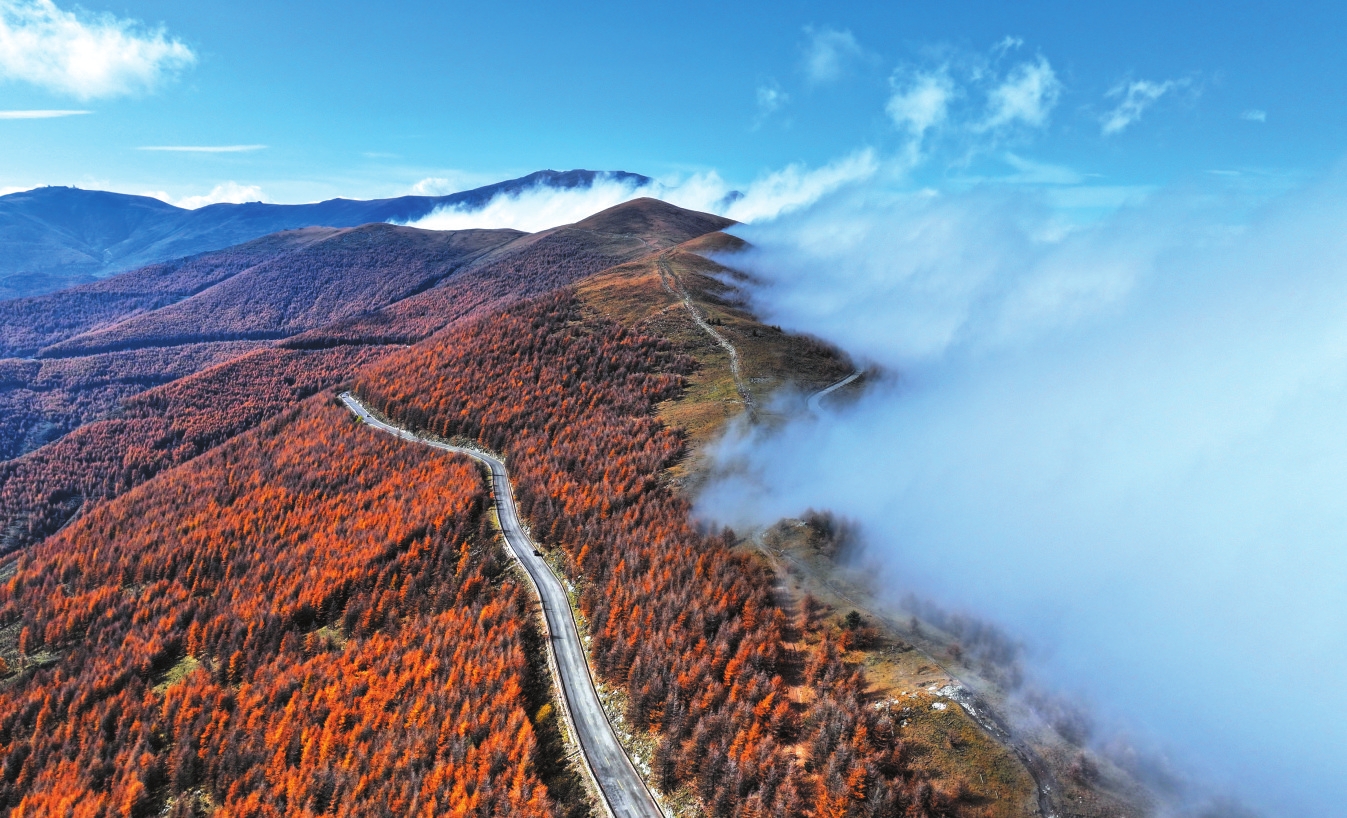 沿盤山路驅(qū)車而上,兩側(cè)的華北落葉松與云杉率先奏響秋之序曲。陽光穿透枝葉,將針葉染成琥珀色;山風(fēng)過處,整片林海翻涌著金色波浪。腳下厚厚的落葉層踩上去沙沙作響,散發(fā)著松針與腐殖土混合的清香。在黛螺頂觀景臺(tái),常有云海自山谷間升騰,將五彩斑斕的山林切割成流動(dòng)的色塊,宛如印象派大師筆下的油畫。