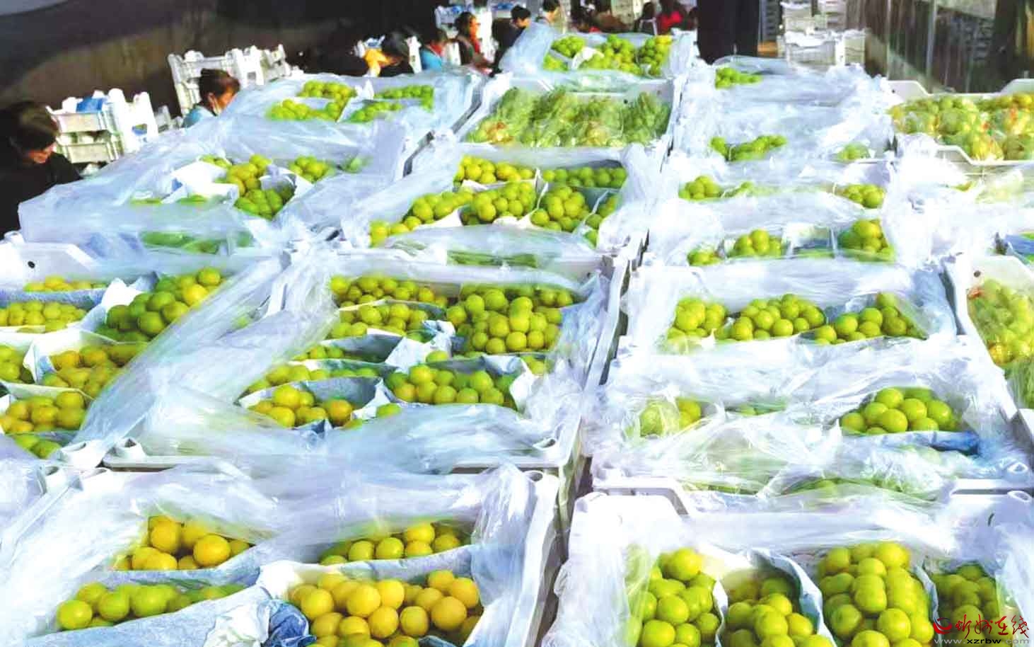 原平市田家莊村陽光玫瑰葡萄是當?shù)靥厣N植產(chǎn)業(yè)。豐收季,210畝優(yōu)質(zhì)葡萄經(jīng)過采摘和精細分揀,便立即送入冷庫保鮮,隨后通過冷鏈物流發(fā)往各地市場,成為助推鄉(xiāng)村振興的“甜蜜產(chǎn)業(yè)”。圖為工人們正在分揀堆至人高的葡萄。 (記者 范琛攝)