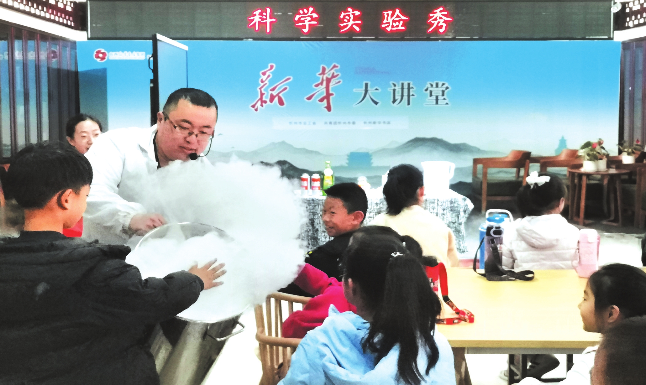 近日,在市圖書大廈“騰云駕霧”科學(xué)實(shí)驗(yàn)秀上,小朋友興奮地觸摸了“白云”。由市總工會(huì)、共青團(tuán)忻州市委主辦,忻州新華書店協(xié)辦,每周一次的“新華大講堂”深受小朋友歡迎。(本報(bào)記者宮清華攝)