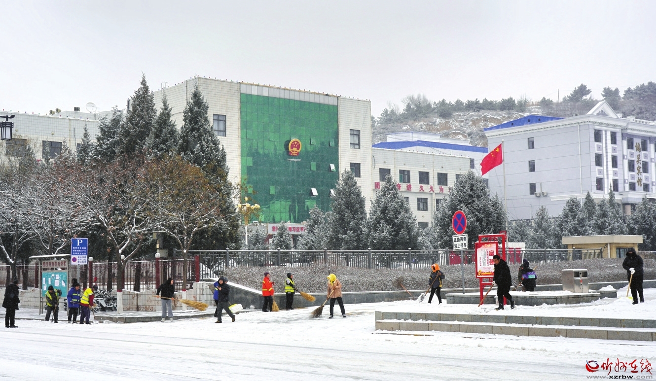 偏關(guān)縣機關(guān)干部、黨員及廣大志愿者走上街頭巷尾掃雪除冰。 陳鑫龍攝