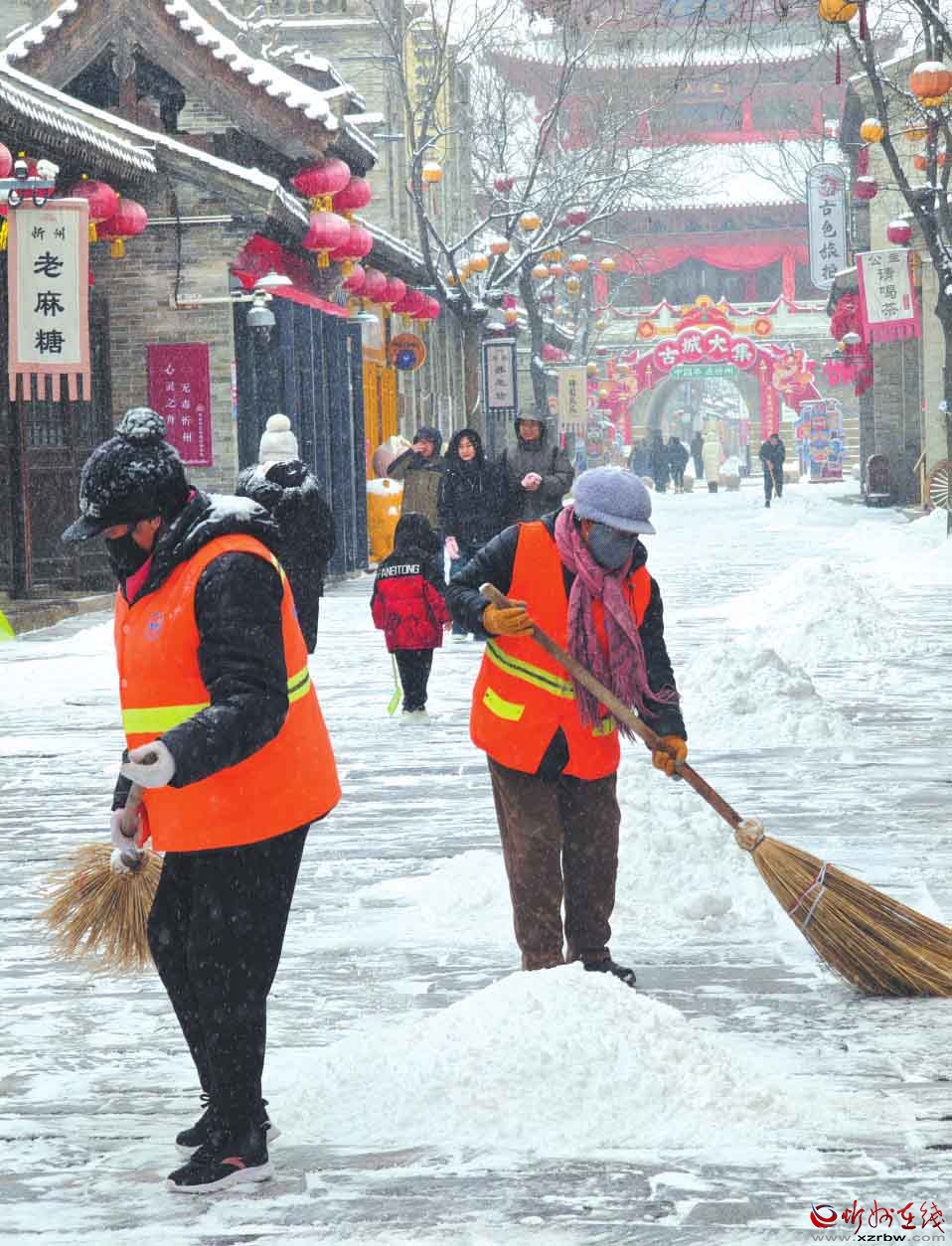 忻州古城環(huán)衛(wèi)工人與沿街商戶揮鍬掄帚掃雪。 本報記者 魏鵬飛攝圖
