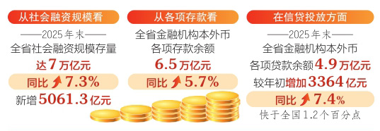 從社會(huì)融資規(guī)模看,2025年末,全省社會(huì)融資規(guī)模存量達(dá)7萬(wàn)億元,同比增長(zhǎng)7.3%;新增5061.3億元。其中,投向?qū)嶓w經(jīng)濟(jì)的本外幣貸款和政府債券凈融資增量合計(jì)占全部社融增量的94.4%。