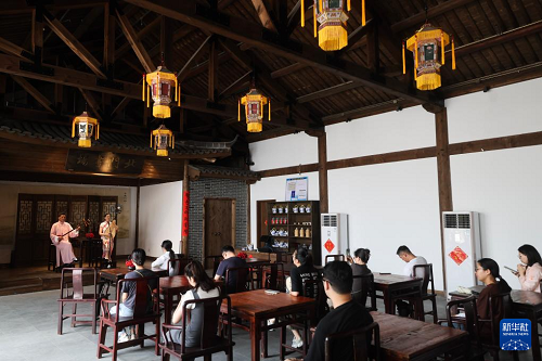 6月19日,游客在鹽官古城潮樂之城觀看評彈說書表演。(新華社記者 徐昱 攝)