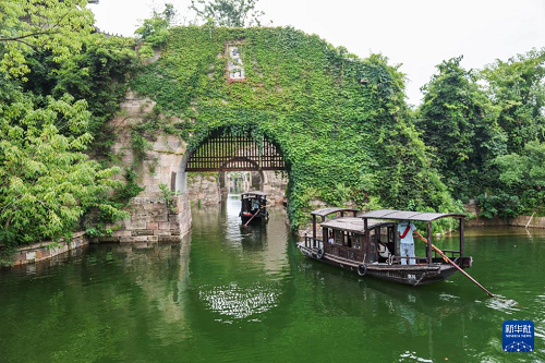 6月19日,游客乘坐手搖船進(jìn)入鹽官古城潮樂之城的拱辰門,景區(qū)手搖船的船夫大多來自周邊的村民。(新華社記者 徐昱 攝)