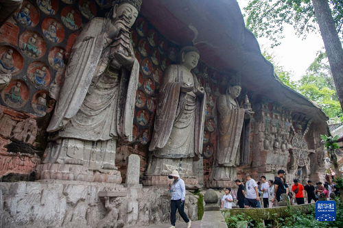 6月24日,游客在大足石刻景區(qū)參觀。(新華社記者 唐奕 攝)