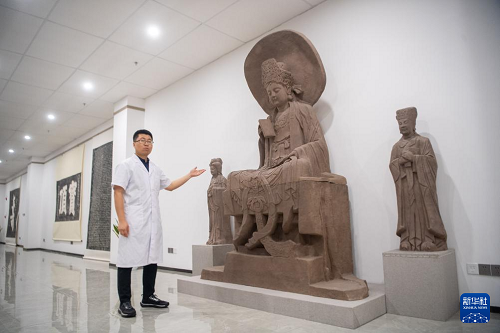 6月24日,在大足石刻文物醫(yī)院,工作人員對(duì)石質(zhì)文物進(jìn)行修復(fù)并采集數(shù)字化信息。(新華社記者 唐奕 攝)