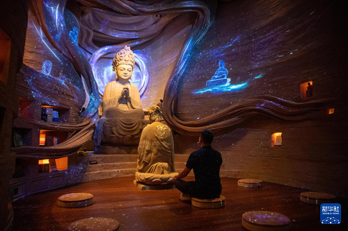 6月24日,游客在大足石刻景區(qū)一處數(shù)字化聲光場(chǎng)景中體驗(yàn)。(新華社記者 唐奕 攝)