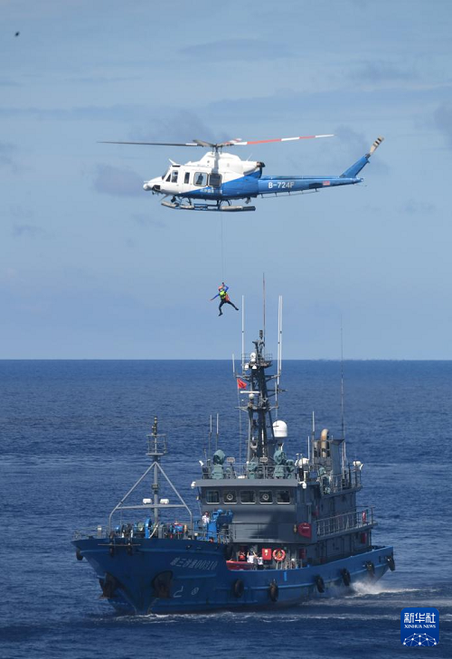 6月26日,救助直升機模擬救助受傷船員。(新華社記者 趙穎全 攝)