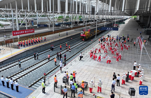7月1日在延安站拍攝的西延高鐵軌道貫通儀式(無人機照片)。(新華社記者 張博文 攝)