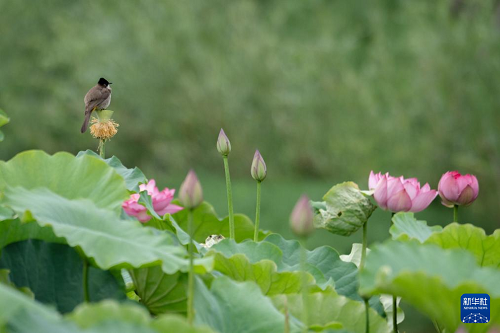 7月5日,在云南省大理白族自治州洱源縣草海濕地,一只小鳥(niǎo)在荷塘駐足。(新華社發(fā) 羅新才 攝)