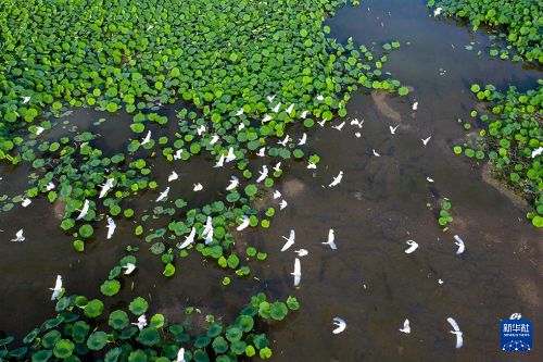 7月5日,白鷺在山東省淄博市高青縣常家鎮(zhèn)一處荷塘飛舞(無(wú)人機(jī)照片)。(新華社發(fā) 張維堂 攝)
