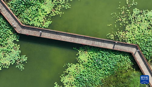 7月5日,游人在河北省石家莊市滹沱河畔賞荷游玩(無(wú)人機(jī)照片)。(新華社發(fā) 梁子棟 攝)