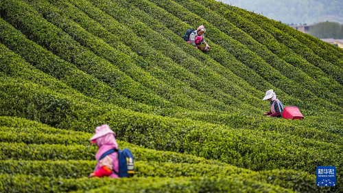 茶農在貴州省安順市西秀區(qū)雙堡鎮(zhèn)山京茶場采茶(2025年4月4日攝,無人機照片)。(新華社記者 陶亮 攝)