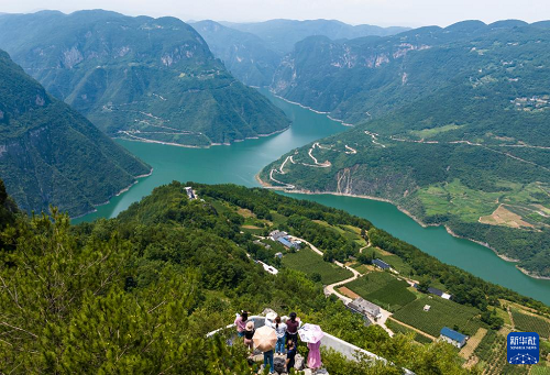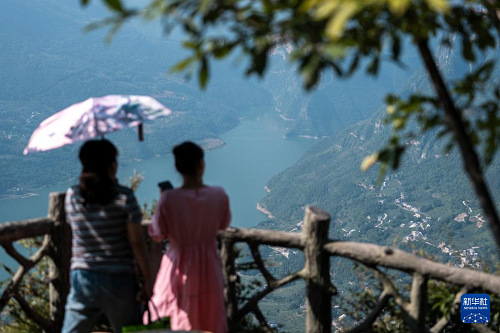 7月7日,在恩施州巴東縣水布埡鎮(zhèn),游客欣賞十字江風(fēng)光(無(wú)人機(jī)照片)。(新華社發(fā) 鄭家裕 攝)