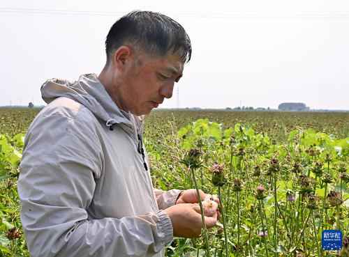 7月8日,一名種植戶在查看水飛薊成熟情況。(新華社記者 吳青昊 攝)