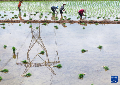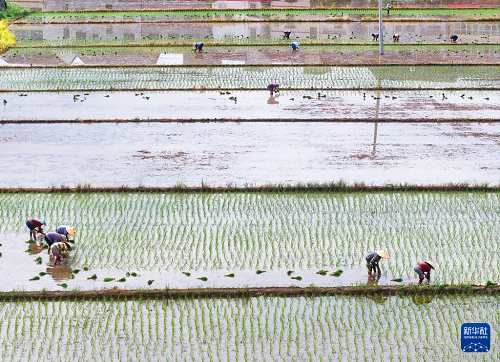 7月13日,湖南省衡陽市衡東縣霞流鎮(zhèn)農(nóng)民在搶插晚稻(無人機照片)。(新華社發(fā) 曹正平 攝)
