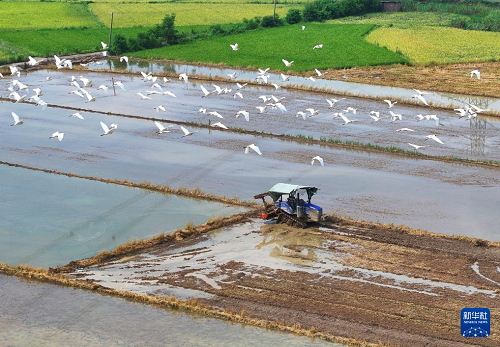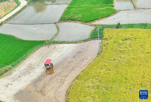 7月13日,湖南省衡陽市衡東縣霞流鎮(zhèn)農(nóng)民駕駛農(nóng)機翻耕稻田(無人機照片)。(新華社發(fā) 曹正平 攝)