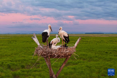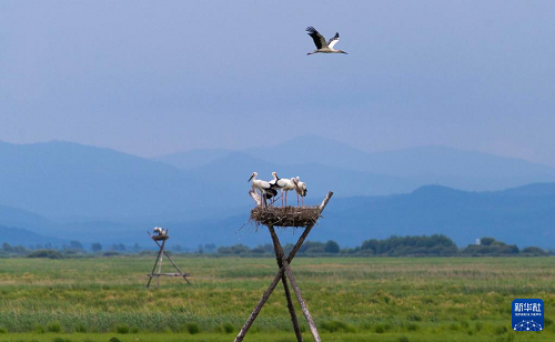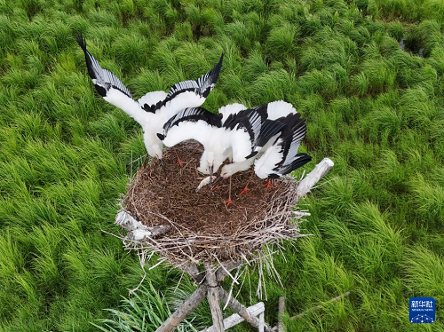 盛夏時節(jié),在位于黑龍江省富錦市的黑龍江三環(huán)泡國家級自然保護區(qū),人工巢內的東方白鸛雛鳥羽翼漸豐,即將離巢。據保護區(qū)管理局介紹,保護區(qū)在落馬湖管護站搭建的20個人工巢今年全部“入住”東方白鸛,共孵育雛鳥70余只。