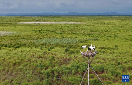 7月13日,在黑龍江三環(huán)泡國家級自然保護區(qū),東方白鸛在人工巢中活動(無人機照片)。(新華社發(fā) 曲玉寶 攝)