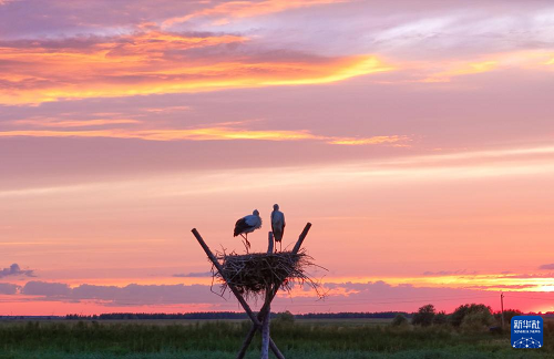 7月13日,在夕陽下的黑龍江三環(huán)泡國家級自然保護區(qū),東方白鸛在人工巢中活動(無人機照片)。(新華社發(fā) 曲玉寶 攝)
