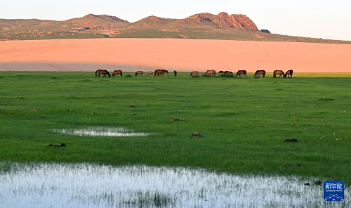 7月21日,馬群在內(nèi)蒙古自治區(qū)赤峰市巴林右旗大板鎮(zhèn)翁根毛都嘎查境內(nèi)的沙地草原吃草。(新華社發(fā) 馬衛(wèi)兵 攝)