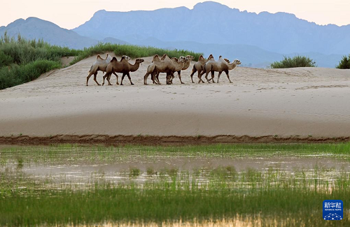 7月21日,駝群在內(nèi)蒙古自治區(qū)赤峰市巴林右旗大板鎮(zhèn)翁根毛都嘎查境內(nèi)的沙地草原漫步。(新華社發(fā) 馬衛(wèi)兵 攝)
