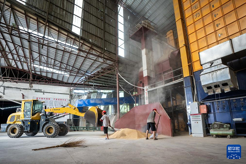 7月24日,在常德市鼎城區(qū)雙橋坪鎮(zhèn)一個(gè)水稻烘干工廠,工人把稻谷放入烘干設(shè)備。(新華社記者 陳思汗 攝)