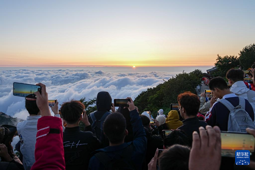 7月31日,游客在泰山景區(qū)日觀峰觀看日出。(新華社記者 朱崢 攝)
