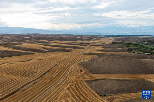 近日,在位于天山北麓的新疆維吾爾自治區(qū)伊犁哈薩克自治州特克斯縣,成熟的小麥迎來收獲。當(dāng)?shù)剞r(nóng)民搶抓有利天氣,開展夏收工作。