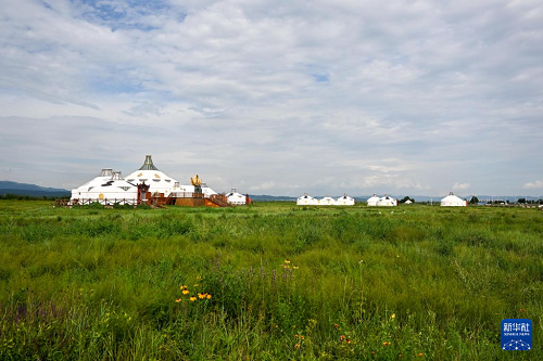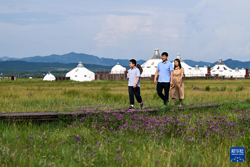 夏日,內(nèi)蒙古呼和浩特市敕勒川草原景色宜人,吸引游客前來觀光游玩。